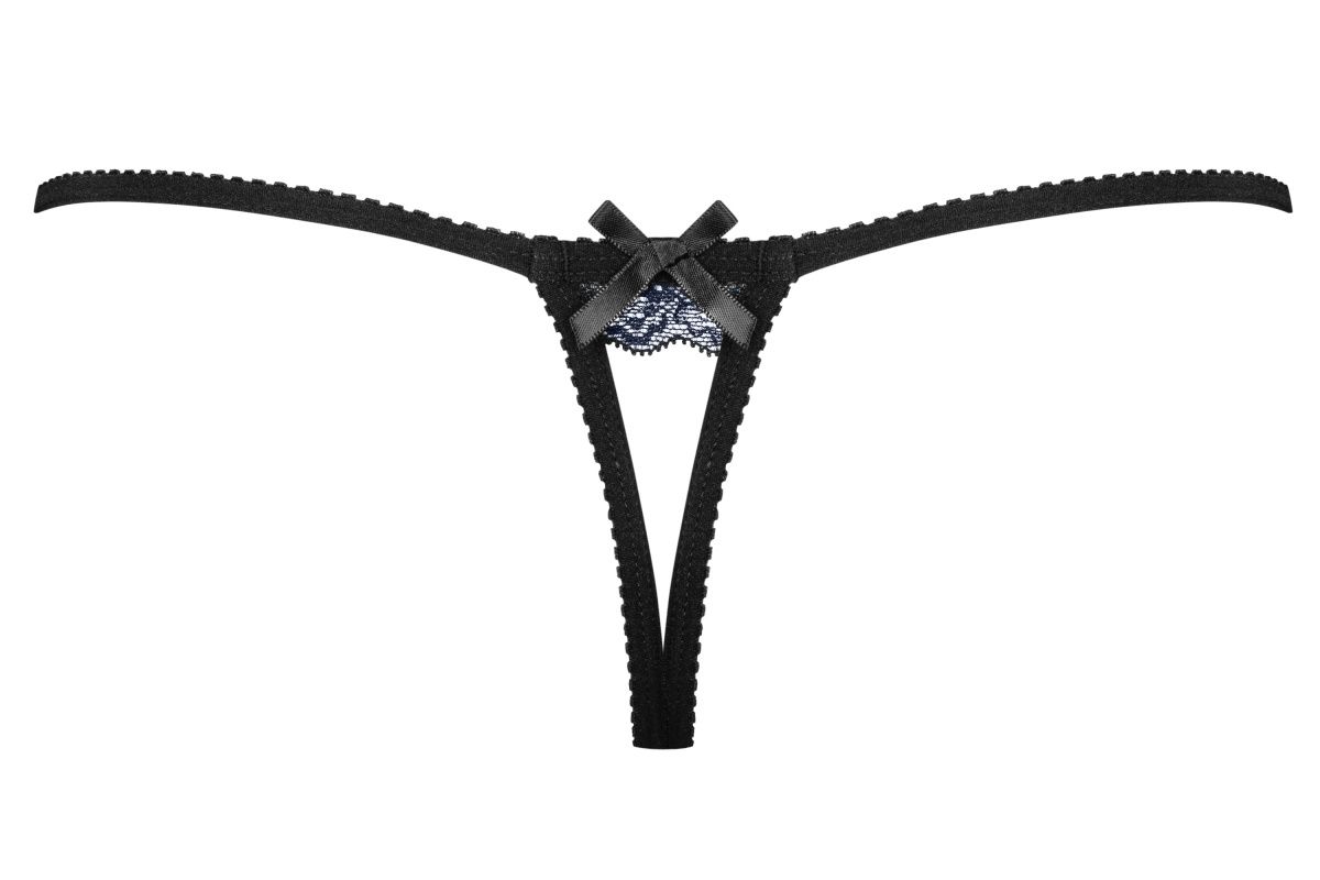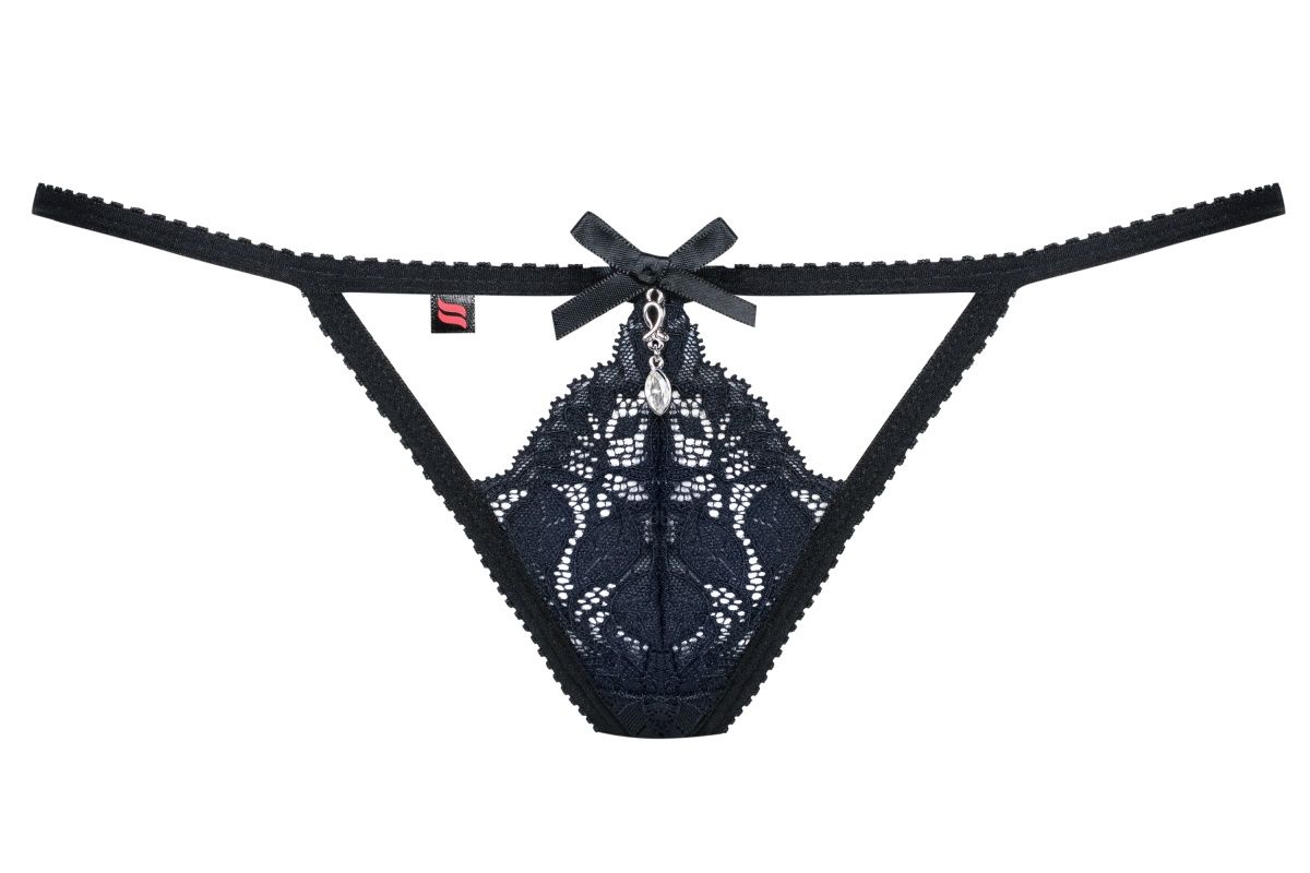 Трусики-стринги с декором из темно-синего кружева.
