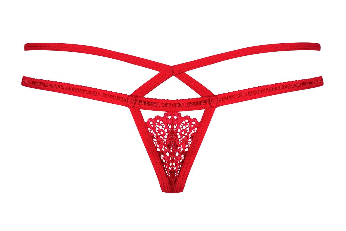 Яркие трусики-стринги с окошком и двойными бретелями.
