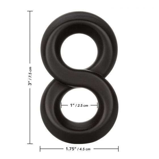 Эрекционное кольцо Crazy 8 – устройство, предназначенное для поддержания эрекции. Кольцо выполнено в виде восьмерки, за счет чего его можно использовать, как для усиленной двойной фиксации на стволе пениса, так и дополнительно на мошонку. Изготовлено из очень эластичного, ультра нежного, бесшовного двойного силикона, что обеспечивает не только растягивание до нужного размера, но и приятные тактильные ощущения. Оба кольца можно закрепить на основании члена, что будет надежно препятствовать оттоку крови. Либо одно из колец можно одеть на мошонку, что обеспечивает утяжку яичек, дополнительно замедляя процесс эякуляции. Внутренний диаметр - 2,5 см.