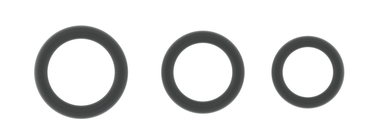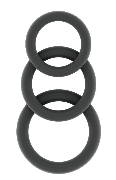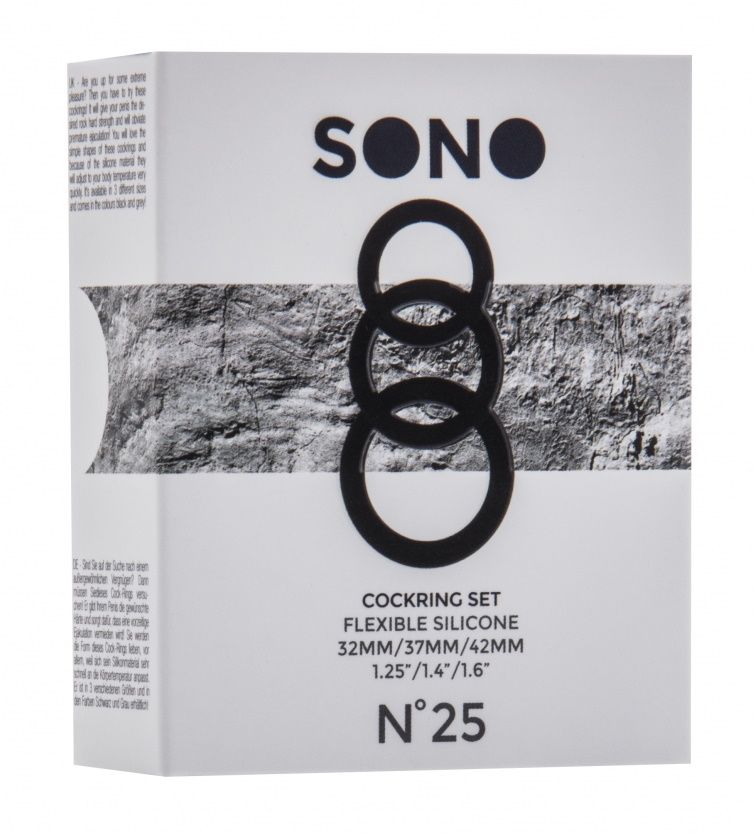 Набор из 3 серых эрекционных колец SONO No.25 разного диаметра. Внутренний диаметр большого кольца - 3 см., внешний - 4,2 см. Внутренний диаметр среднего кольца - 2,5 см., внешний - 3,7 см. Внутренний диаметр малого кольца - 2,2 см., внешний - 3,2 см.