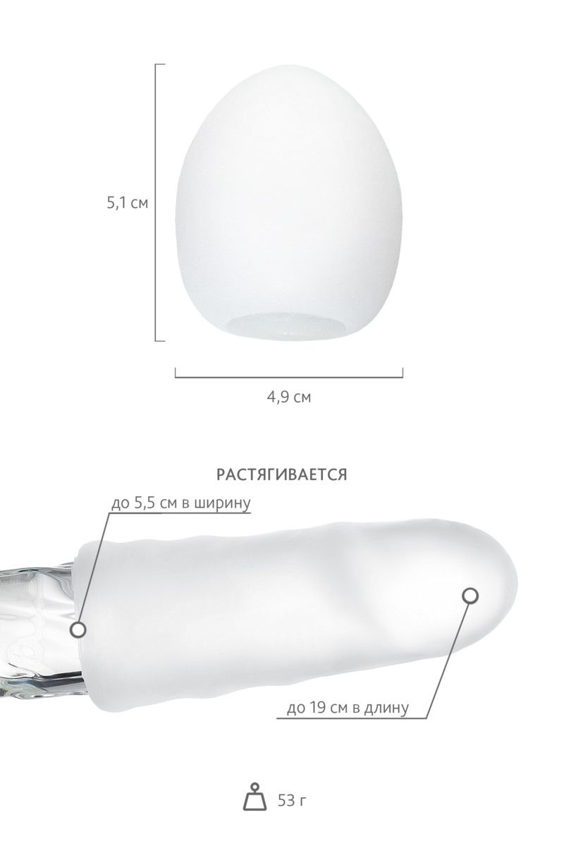 Tenga Egg Cloudy – настоящая сенсация в мире мастурбаторов. Выполненный в форме яйца в корпусе-скорлупе, он идеально подойдёт любому мужчине, вне зависимости от длины его полового члена. Вам больше не придётся проникать внутрь мастурбатора, поскольку эта маленькая игрушка работает по-другому. Просто введите головку члена в отверстие снизу, предварительно воспользовавшись смазкой (идёт в комплекте). А после – натяните яйцо на всю длину пениса. Эластичный и очень приятный на ощупь материал укроет предмет вашей гордости, а также приласкает ствол своим рельефом - в виде закрученных в спирали бороздок. Чувственная стимуляция и яркий оргазм гарантированы! Размер - 5,3 х 5,3 х 7 см.