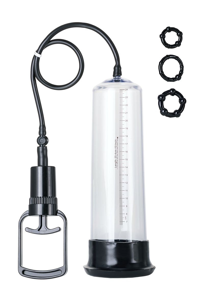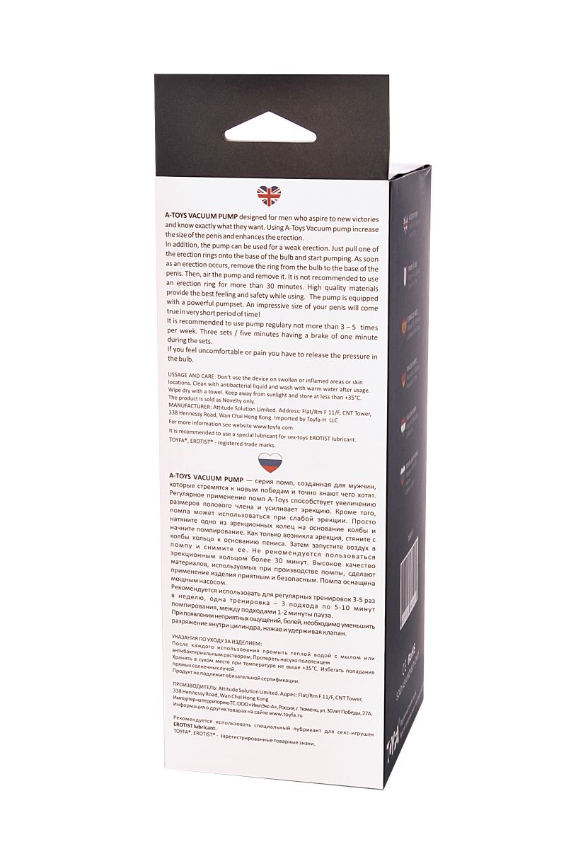 A-Toys Vacuum pump — серия помп, созданная для мужчин, которые стремятся к новым победам и точно знают чего хотя. Регулярное применение помп Atoys способствует увеличению размеров полового члена и усиливает эрекцию. Высокое качество материалов, используемых при производстве помпы, сделают применение изделия приятным и безопасным. Помпа оснащена мощным насосом. В комплекте: вакуумная помпа, 3 эрекционных кольца.