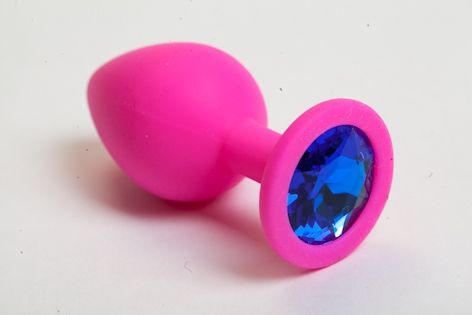 Розовая анальная пробка с синим кристаллом. Широкое основание позволяет максимально безопасно использовать этот интимный аксессуар.