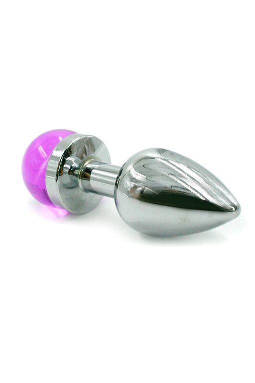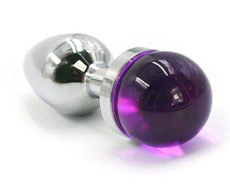 Анальная пробка из алюминия размер S. Изделие дополнено выпуклым украшением из стекла сферической формы фиолетового цвета. Упакована в вельветовый мешочек для хранения. Вес - 85 гр.