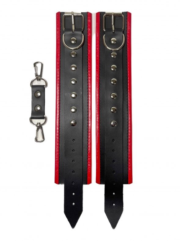 Красивые и функциональные наручники, выполненные из искусственной кожи. Декорированы металлической фурнитурой и красными вставками по краям. Обхват удобно регулируется с помощью пряжек. В комплекте идет соединение с карабинами. Очень экономичный, экологичный и практически незаменимый аксессуар для вашей любовной игры! Ширина - 5,5 см. Длина соединения - 11 см.