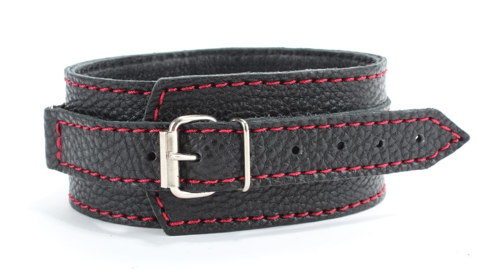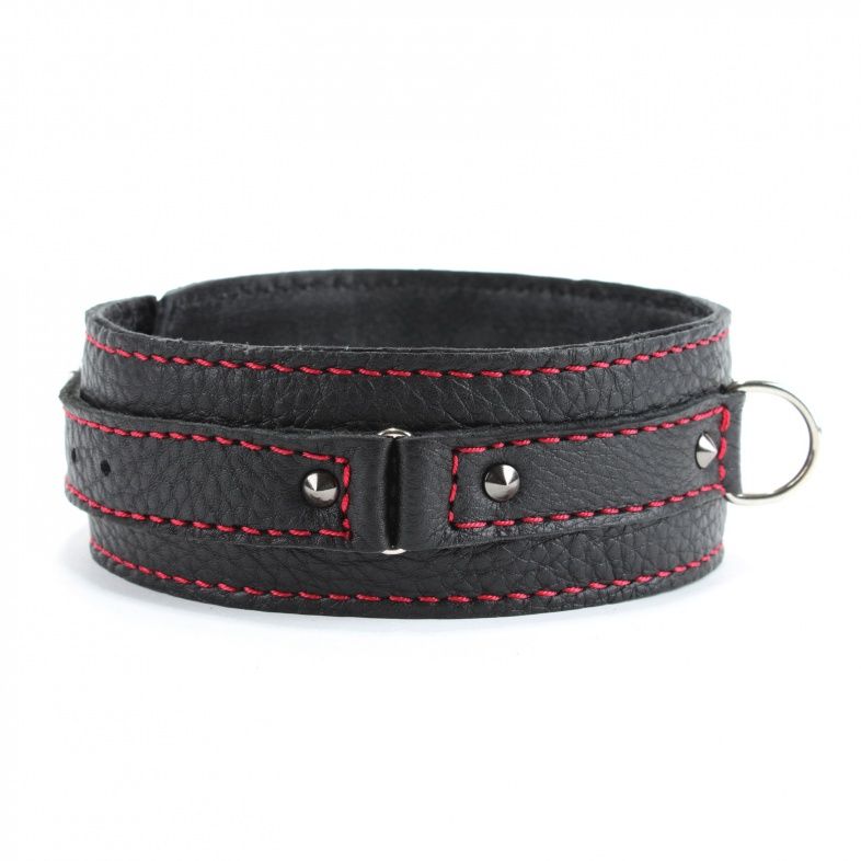 Черный кожаный ошейник с красной оторочкой. Декорирован небольшими шипами в передней части изделия. Имеет D-кольцо для карабина. Имеет 7 отверстий для регулировки размера. Ширина - 5 см.