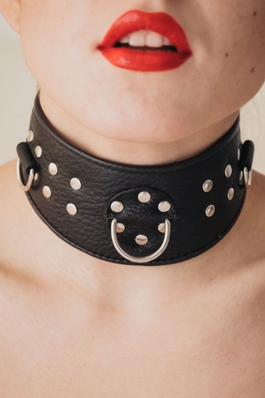 Кожаный ошейник для эротических игр имеет три крепления для поводка или наручников. Выполнен с применением металлических клепок.