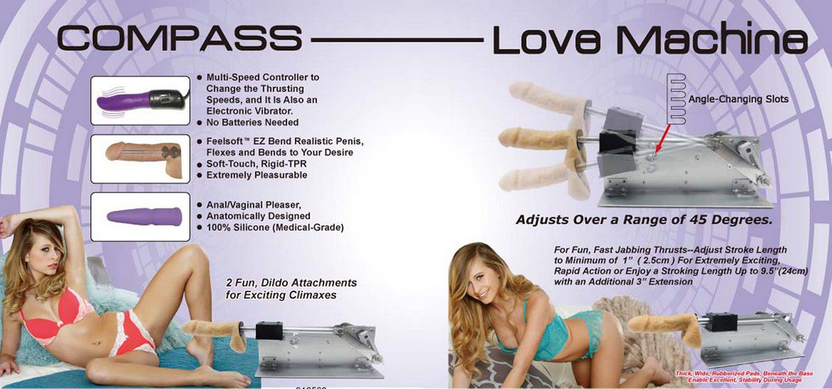Секс-машина Compass с телесной насадкой фаллосом. Работает от сети 220V. Совершает толчки с частотой от 39 до 200 ударов в минуту. 5 регулируемых углов наклона. Длина хода - от 2,5 до 16 см. В комплекте лиловый анальный плаг-насадка и фиолетовый вибромассажёр-контроллер. Габариты - 54 х 37,5 x 24,8 см. Длина фаллоса - 16 см.