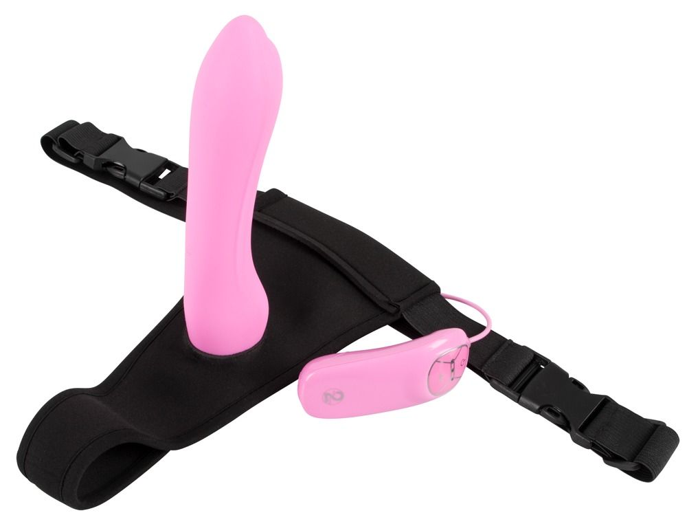 Черные трусики с растягивающимся отверстием спереди для вибратора или фаллоимитатора с основанием (не входят в комплект). Окружность может быть отрегулирована от 80 до 120 см. благодаря застежке. Диаметр отверстия - 2,1 см.(тянется)
