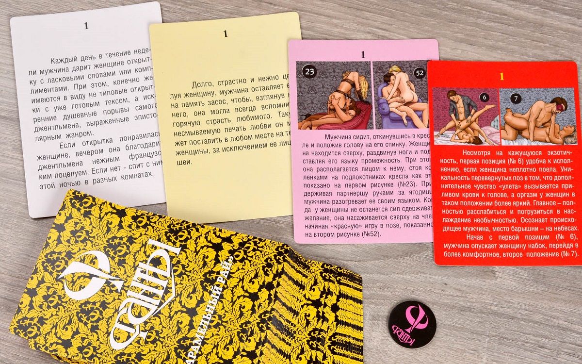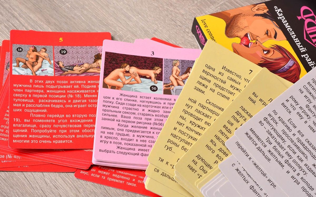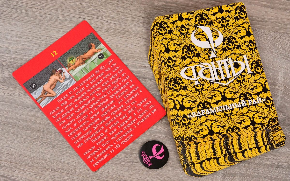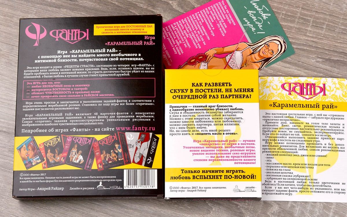 Воплощение сладких желаний Говорят, что стоит попасть на удочку привычки — и прощай, супружеская любовь. А ведь это совсем не повод скандалить, менять партнёра или заводить интриги на стороне. «Стряхнуть пыль» с прежних отношений очень просто, играя в фанты «Карамельный рай». Веселая эротическая игра снова превратит супружескую спальню в райское местечко. Волшебный и загадочный Восток На Востоке всегда знали толк в любовных утехах. Но вам не придётся тратить время на поиски проверенных восточных рецептов страсти: многое уже предложено в этих фантах. Проникновенная, сладострастная близость, дополненная очарованием Востока и тайнами тантрического секса, позволит по-новому узнать любимого человека, добавив новых красок в интимные отношения. Фанты бывают разные: жёлтые или красные На самом деле фантов в игре четыре вида: белые, жёлтые, розовые и красные. Игроки втёмную выбирают фант, на обратной стороне которого написано задание. Игра начинается с простых заданий на белых фантах, цель которых развеселить и слегка возбудить партнёров. Дальше играют жёлтые фанты, а задания становятся более сексуальными. Продолжая игру, партнёры переходят к розовым и красным карточкам, всё более отдаваясь страстным порывам и удовлетворяя друг друга всевозможными способами. Формула сохранения любви Новые удовольствия со старым партнёром — это лучшая возможность разнообразить личную жизнь без романов на стороне. Игра познакомит с новыми позами, заставит экспериментировать в постели и открывать в себе новые океаны нежности и любви. Задания в игре часто предлагают применение секс-игрушек, сексуального белья и интимной косметики. Долой стеснительность! Фанты «Карамельный рай» научат быть уверенным в себе и партнёре на сто процентов. Подарок, который оценят по достоинству: Молодожёны, только отрывающие для себя все тайны и прелести близких отношений Постоянный партнёр, который совсем не прочь подлить масла в костёр любви Сторонники активной жизни и любви, желающие добавить новизны в отношения и до конца раскрыть свой чувственный потенциал. Что в коробке? В яркой, привлекательной коробке вас ждут умопомрачительные задания, новые секс-позиции и даже настоящие сценарии для ролевых игр. Всё это представлено на 48 красочных, со вкусом оформленных карточках-фантах.