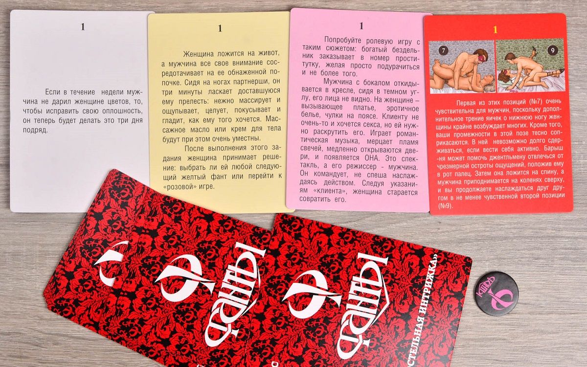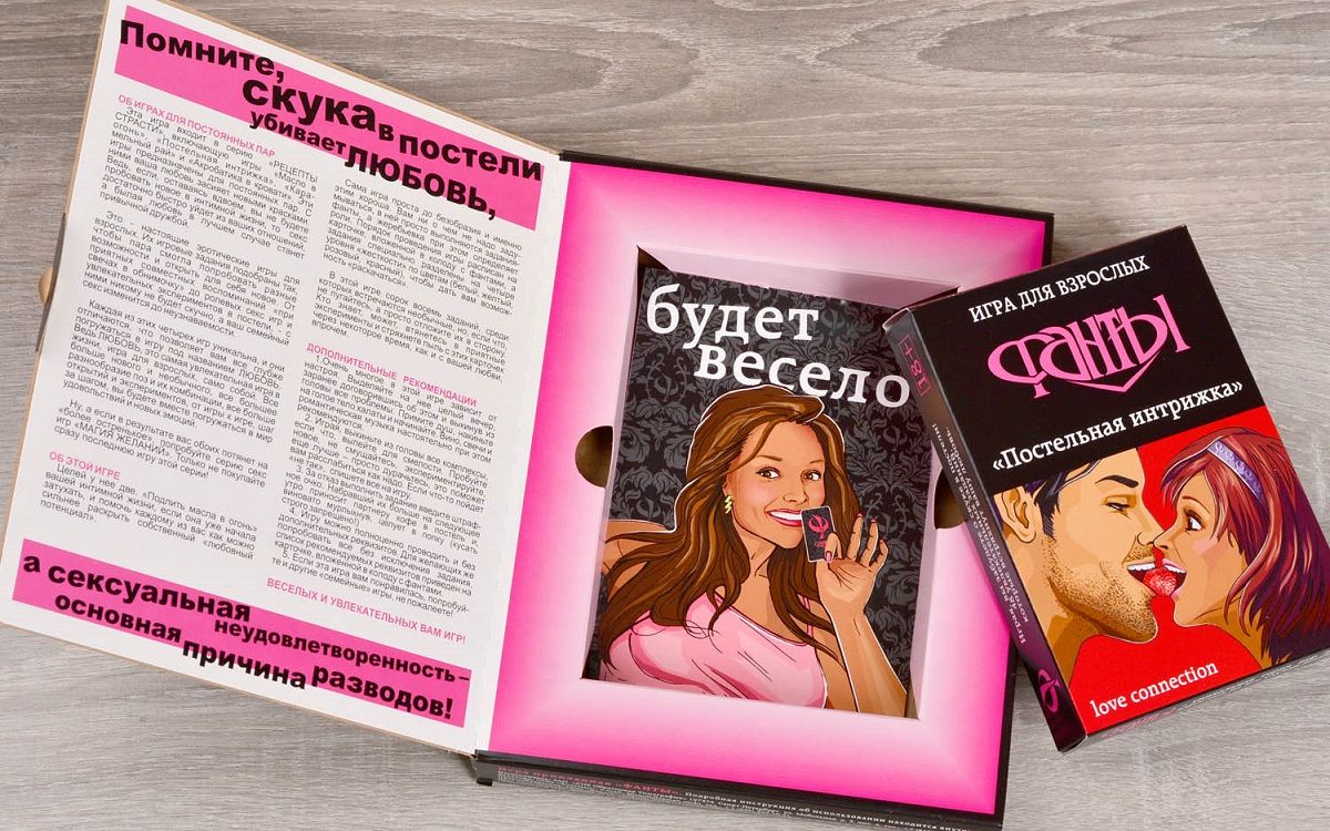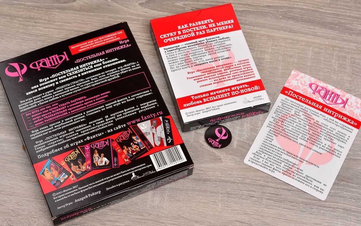 Увлекательное времяпровождение Если в сексуальные отношения пришли обыденность и скука, значит пора что-то менять. Наверное, вряд ли кто-нибудь захочет проверять эту истину на собственном опыте, рискуя отношениями с любимым человеком. Куда лучше спохватиться при первых признаках остывания чувств и позаботиться о том, чтобы проведённое вместе время проходило увлекательно и незабываемо для обоих партнёров. В этом деле лучшее подспорье — фанты «Постельная интрижка». Интригующее начало В фанты умеют играть практически все, ведь правила просты и незатейливы. А вот задания, которые придётся выполнять фантующим в «Постельной интрижке», совсем не простые. Правда, сначала разыгрываются белые фанты с лёгкими возбуждающими заданиями, выполнить которые не составит труда даже неискушённым любовникам. Горячее продолжение Разжигать дальше любовные страсти призваны жёлтые и розовые фанты. Здесь уже нужно проявлять ласку и нежность к партнёру, а может статься, что и начать весёлую ролевую игру. В финале игры задания приводят к красному фанту, который познакомит игроков с интересными позами и принесёт самые яркие сексуальные впечатления. Все задания содержат подробные описания по организации и проведению игры, а также рекомендации по применению аксессуаров для секса. Для кого эта игра? Для тех, кто лучше желает узнать партнёра и реализовать совместный чувственный потенциал у кого хватает смелости внести в семейный секс свежесть и новизну кто не любит скучать в постели, разглядывая потолок кто намерен внести разнообразие в сексуальную жизнь с помощью ролевых эротических игр. Содержимое коробки: Всего 48 красивых, иллюстрированных фантов подарят вам множество незабываемых минут интимного общения.