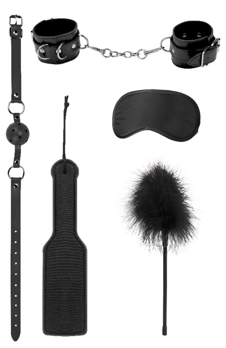 Introductory Bondage Kit №4 – набор, состоящий из 5 предметов для эротических ролевых игр и практик БДСМ. В комплекте: кляп-шарик, наручники, маска, пуховка. Длина пуховки - 28 см. Длина шлепалки - 30,5 см.