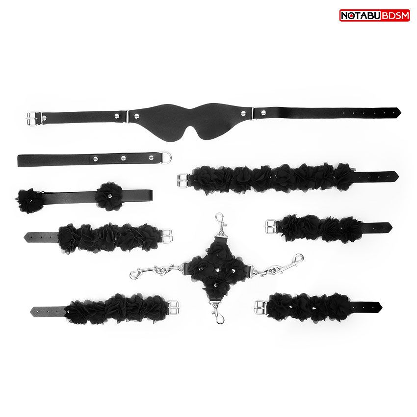 Великолепный набор аксессуаров для любителей БДСМ-игр. В комплект входят маска, фиксатор, ошейник с поводком, наручники, оковы, шлёпалка. Наручники, оковы, ошейник и маску можно регулировать по размеру. Изделия украшены декоративными цветами и оснащены качественной фурнитурой. В набор входит специальная сумка с ручкой-цепочкой для хранения интимных аксессуаров и презентабельная упаковочная коробка. В комплекте: маска, фиксатор, ошейник с поводком, наручники, оковы, шлёпалка. Длина шлепалки - 25 см.