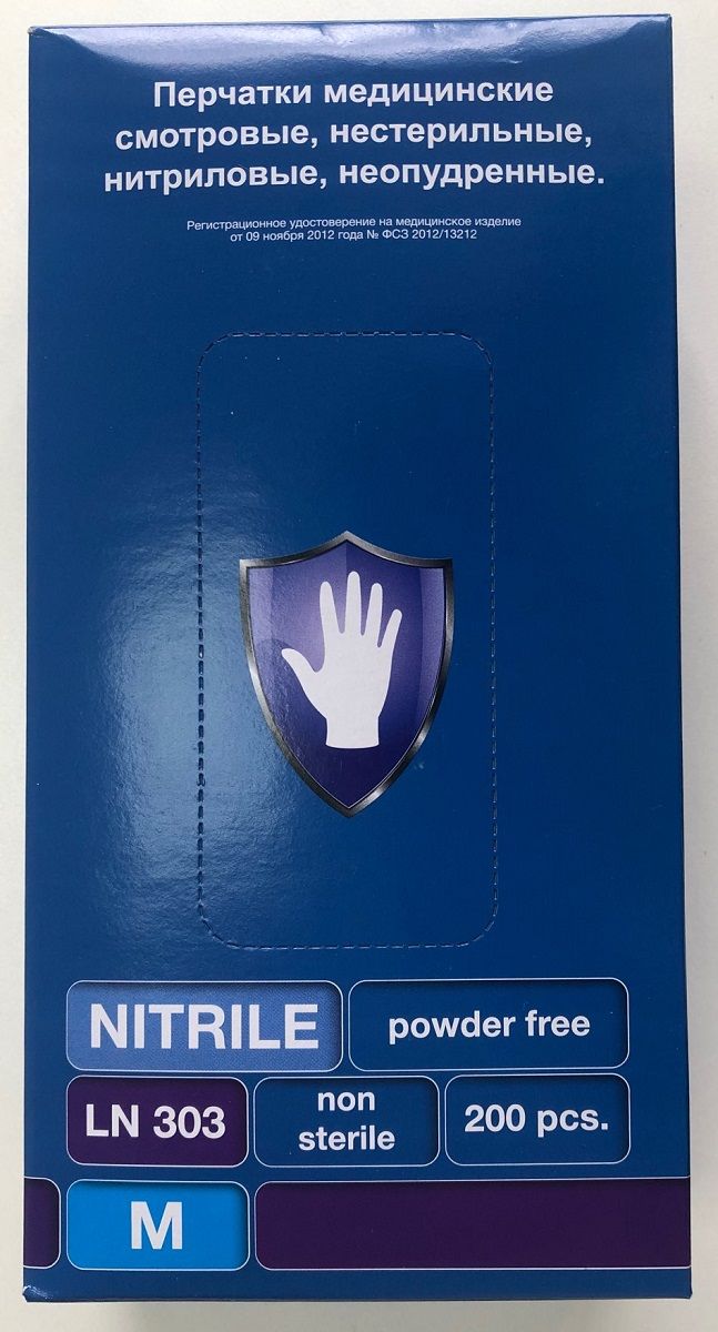 Перчатки медицинские смотровые из искусственного нитрила Safe&Care LN 303. Текстурированная поверхность на пальцах, универсальной плоской формы, манжета с валиком, гипоаллергенные, нестерильные. Состав перчаток не содержит протеинов латекса натурального каучука и не вызывает аллергических реакций. Длина - 245+/-5 мм. Толщина пальца (13 мм от кончика) - 0,16+/-0,02 мм. Толщина ладони (центр) - 0,15+/-0,02 мм. Толщина манжеты (25 мм от валика) - 0,10+/-0,02 мм. Герметичность AQL 1.5