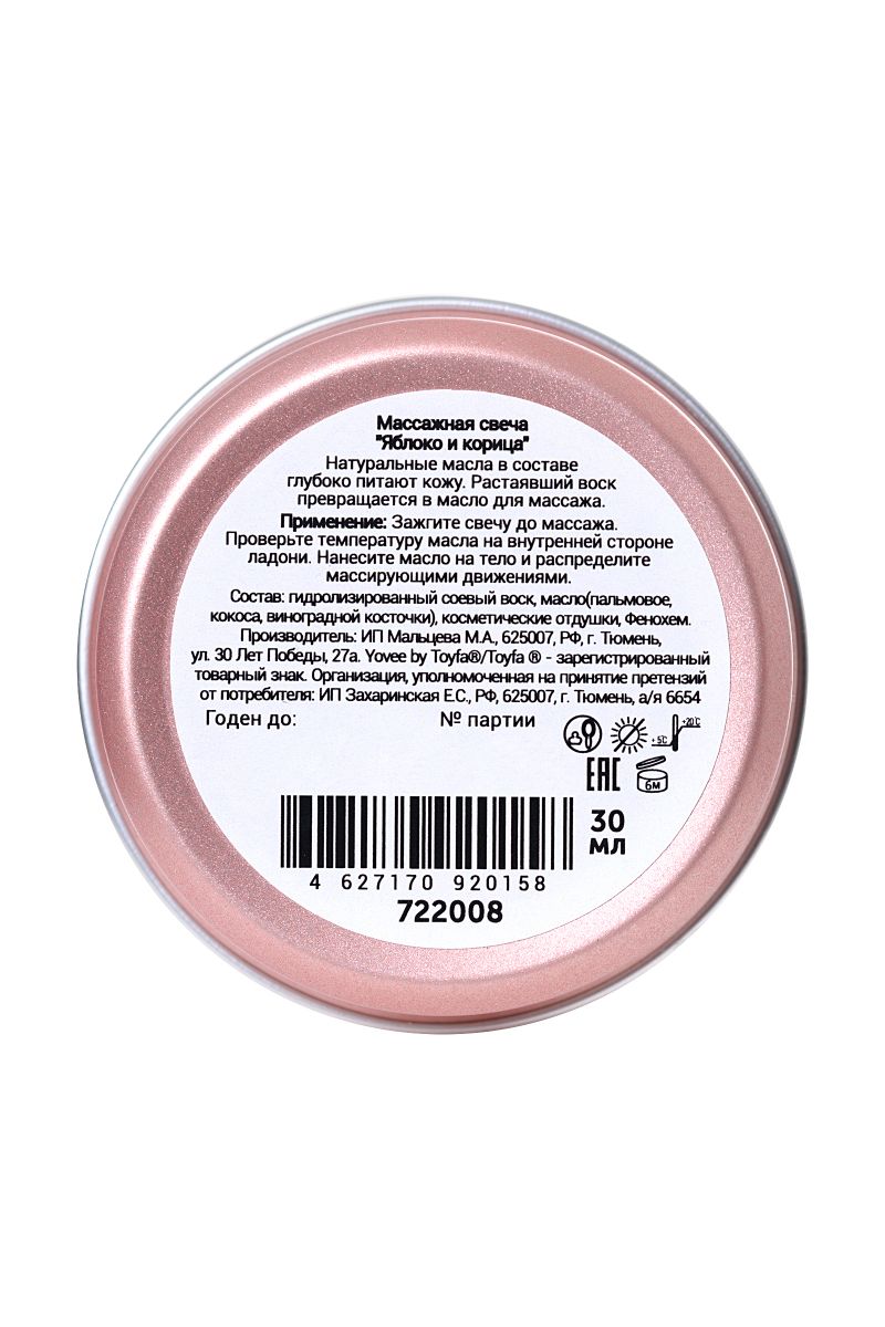 Натуральные масла в составе глубоко питают и увлажняют кожу. Растаявший воск превращается в масло для массажа. Свеча поможет подготовить вашу кожу к свиданию.Подготовьтесь к свиданию: после приятной и расслабляющей ванны зажгите свечу. Насладитесь пряными ароматами яблока с корицей, которые наполнят вашу комнату. Зажгите свечу и немного подождите, пока масло остынет. Нанесите масло на всё тело и сделайте лёгкий, расслабляющий массаж. После питательных масел ваша кожа будет мягкой и нежной.Свеча подарит незабываемые ощущения, после которых вам гарантированы нежные и мягкие прикосновения!