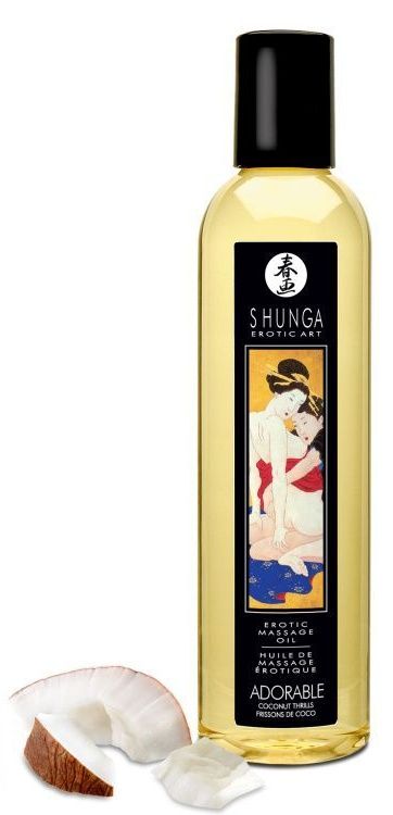 Массажное масло Shunga Erotic Massage Oil с ароматом кокоса. 100% натуральные масла холодного отжима, с витамином Е (антиоксидант), без жирных остатков, не забивает поры, нет минерального или животного масла. Мягкость и шелковистость этого масла с приятным скользящим эффектом на коже вызывает ощущение полного восторга. Сексуальное желание нарастает и вы готовы к любви. Получите взаимное удовольствие от чувственного эротического массажа с использованием нашей эксклюзивной смеси масел холодного отжима, тщательно отобранных за свои стимулирующие и придающие энергию свойства. Масло легко скользит по коже, не оставляя жирных ощущений, в то время как различные экзотические ароматы поднимут ваши чувства до вершин возбуждения. Идеально подходит для того, чтобы насладиться расслабляющим массажем или сделать его, совместив с обволакивающими обольстительными ласками. Это на 100 % натуральное масло с упоительным ароматом, легко скользит по коже, не оставляя жирной пленки. Запах массажному маслу придают эфирные масла и отдушки, что в отличие от большей части другой продукции SHUNGA, ароматизированной вкусовыми добавками, делает его несъедобным.