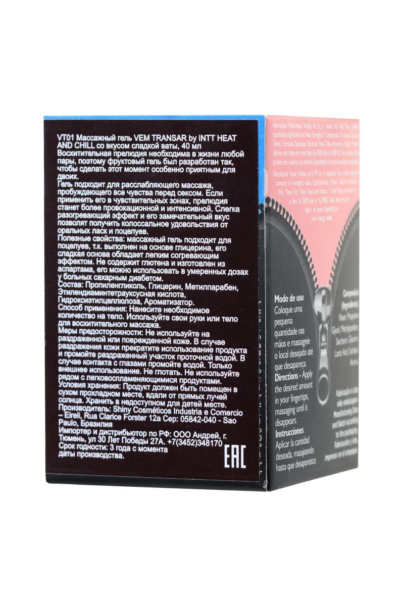 Искра. Буря. Экстаз. Может ли массаж подарить такое? Может, если это массажное масло для поцелуев Intt Vem Transar heat and chill со вкусом сахарной ваты. Позволяет экспериментировать. Поскольку масло обладает разогревающим эффектом и предназначено для поцелуев, можно не ограничивать себя в сценариях романтических игр. Нанесите Intt Fruit Sexy на тело, в том числе на интимные места, поцелуйте их, а потом подуйте в течение 3 секунд — возбуждение не заставит себя долго ждать. Провоцирует желание. Аппетитный аромат сладкой ваты создает игривое настроение и помогает расслабиться. Абсолютно безопасная и протестированная формула без сахара и глютена подходит даже аллергикам и диабетикам. Не оставляет ощущения липкости и легко смывается водой. INTT — удовольствие в каждой капле.
