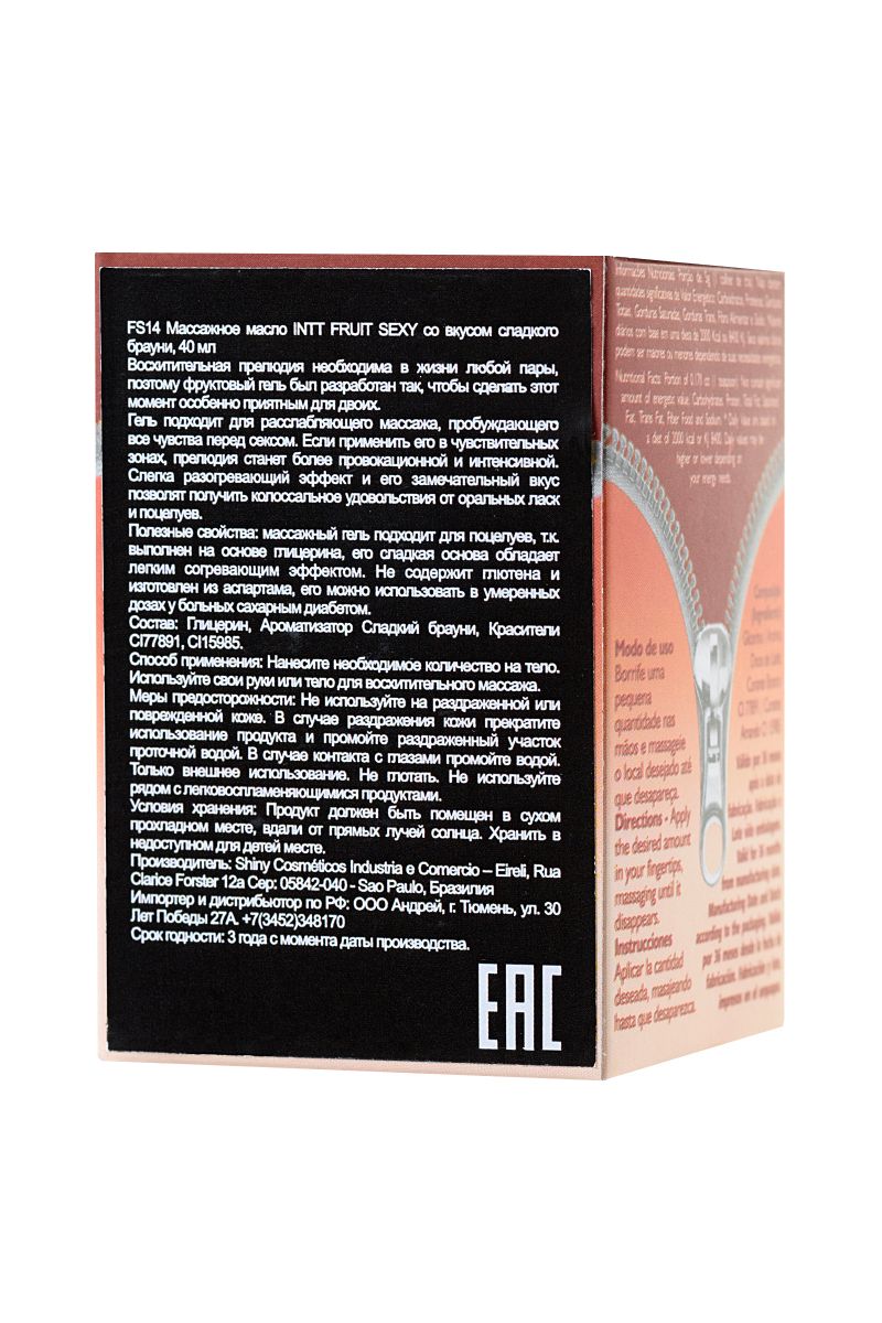 Искра. Буря. Экстаз. Может ли массаж подарить такое? Может, если это массажное масло для поцелуев Intt Fruit Sexy с ароматом сладкого брауни. Позволяет экспериментировать. Поскольку масло обладает разогревающим эффектом и предназначено для поцелуев, можно не ограничивать себя в сценариях интимных игр. Нанесите Intt Fruit Sexy на тело, поцелуйте несколько чувствительных точек и подуйте на них в течение 3 секунд — возбуждение не заставит себя долго ждать. Провоцирует желание. Аппетитный аромат сладкого брауни создает игривое настроение и помогает расслабиться. Абсолютно безопасная и протестированная формула без сахара и глютена подходит даже аллергикам и диабетикам. Не оставляет ощущения липкости и легко смывается водой.INTT — удовольствие в каждой капле.