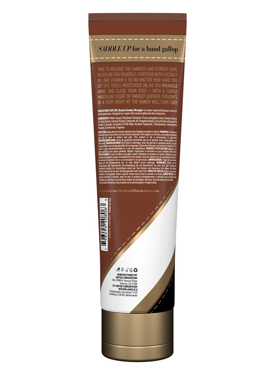 Bucked Smokey Wrangler – крем для мастурбации с ароматом сыромятной кожи с древесными нотками, обогащенный кокосовым маслом и витамином E. Обеспечивает легкое и комфортное скольжение, а кокосовое масло и витамин E обеспечивают дополнительный уход.