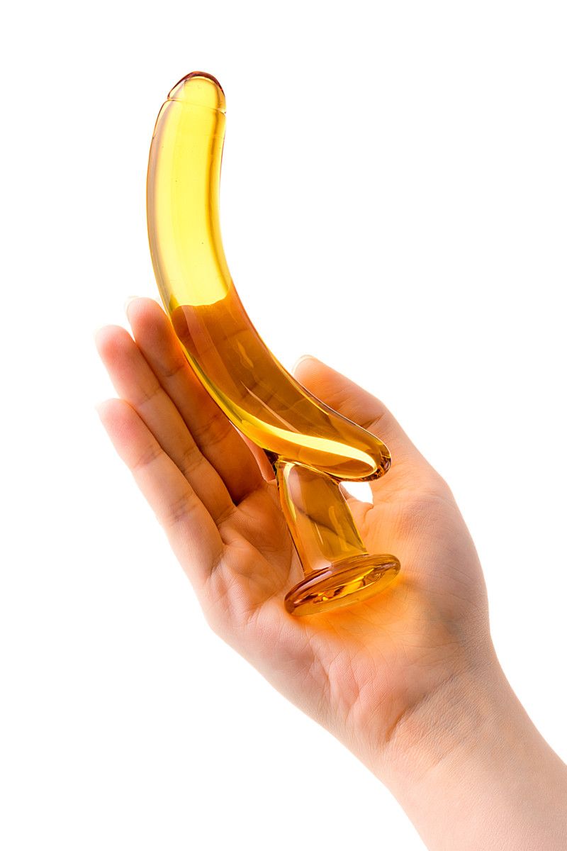 Ваша жизнь обязательно станет ярче и слаще, если вы решите использовать этот оригинальный стимулятор из жёлтого стекла. Напоминая по форме банан на подставке, он обещает массу сильных ощущений при вагинальной или анальной стимуляции. Благодаря изогнутой форме и гладкой, обеспечивающей идеальное скольжение поверхности, «банан» идеально подходит для массажа точки G у женщин и простаты у мужчин. Длина – 16,5 см. Ширина – 2 см.