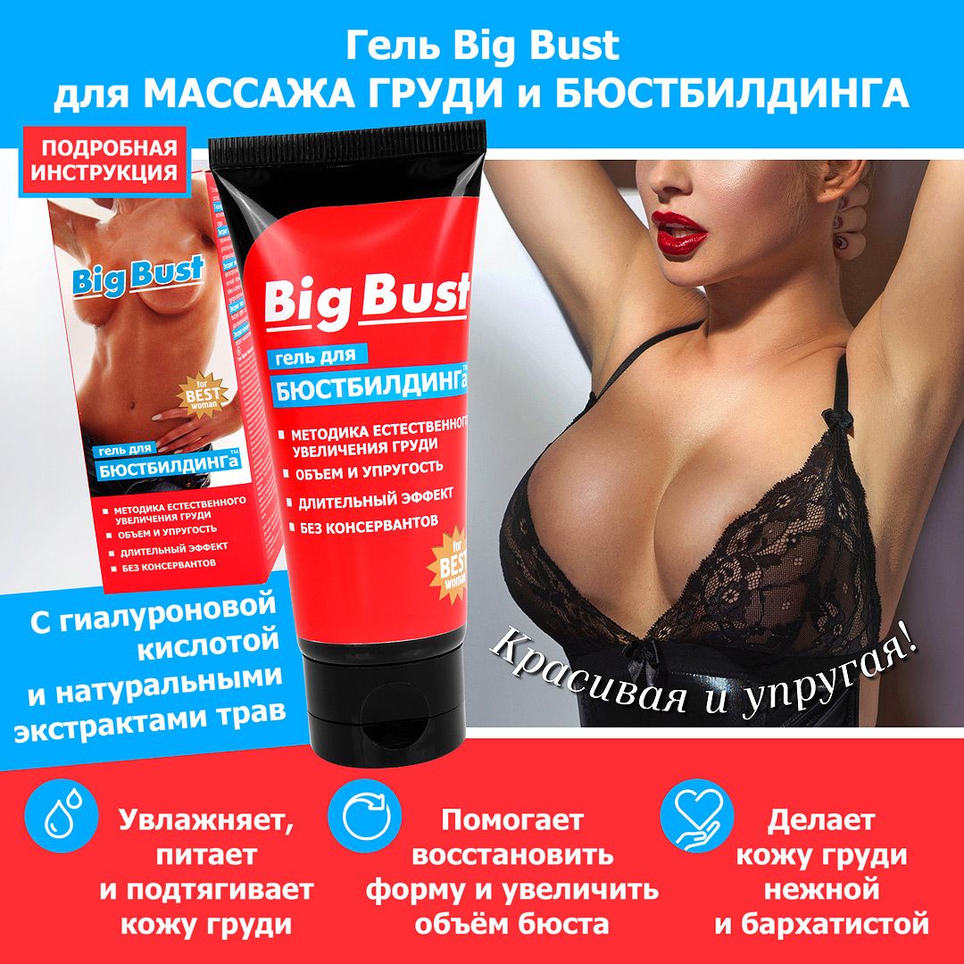 Крем для бюста Big Bust – отличная профилактика потери упругости. Нанесите его массажными движениями на грудь, и он усилит образование липидных тканей. Big Bust увлажняет кожу, оказывает подтягивающее действие (что особенно важно женщинам, прекратившим грудное вскармливание). При регулярном использовании способствует увеличению объёма бюста.