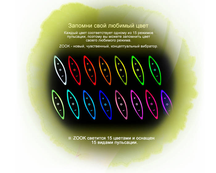 ZINI ZOOK - первый эргономичный Хай-тек нового поколения с уникальным изгибом 23,5 градуса и объемной формой, создающей ощущение заполненности. В дизайне использован мотив тропического бамбука, листок которого нежно ласкает вульву. Каждый из 15 вариантов вибрации и пульсации соответствуют определённому цвету, что позволяет установить любимый режим даже в темноте. Полностью заряженный аккумулятор рассчитан на 4 часа непрерывной работы, зарядное устройство в комплекте. Дизайнерская упаковка делает ZINI роскошным подарком. Длина - 20,2 см. Диаметр - 3,3 см.